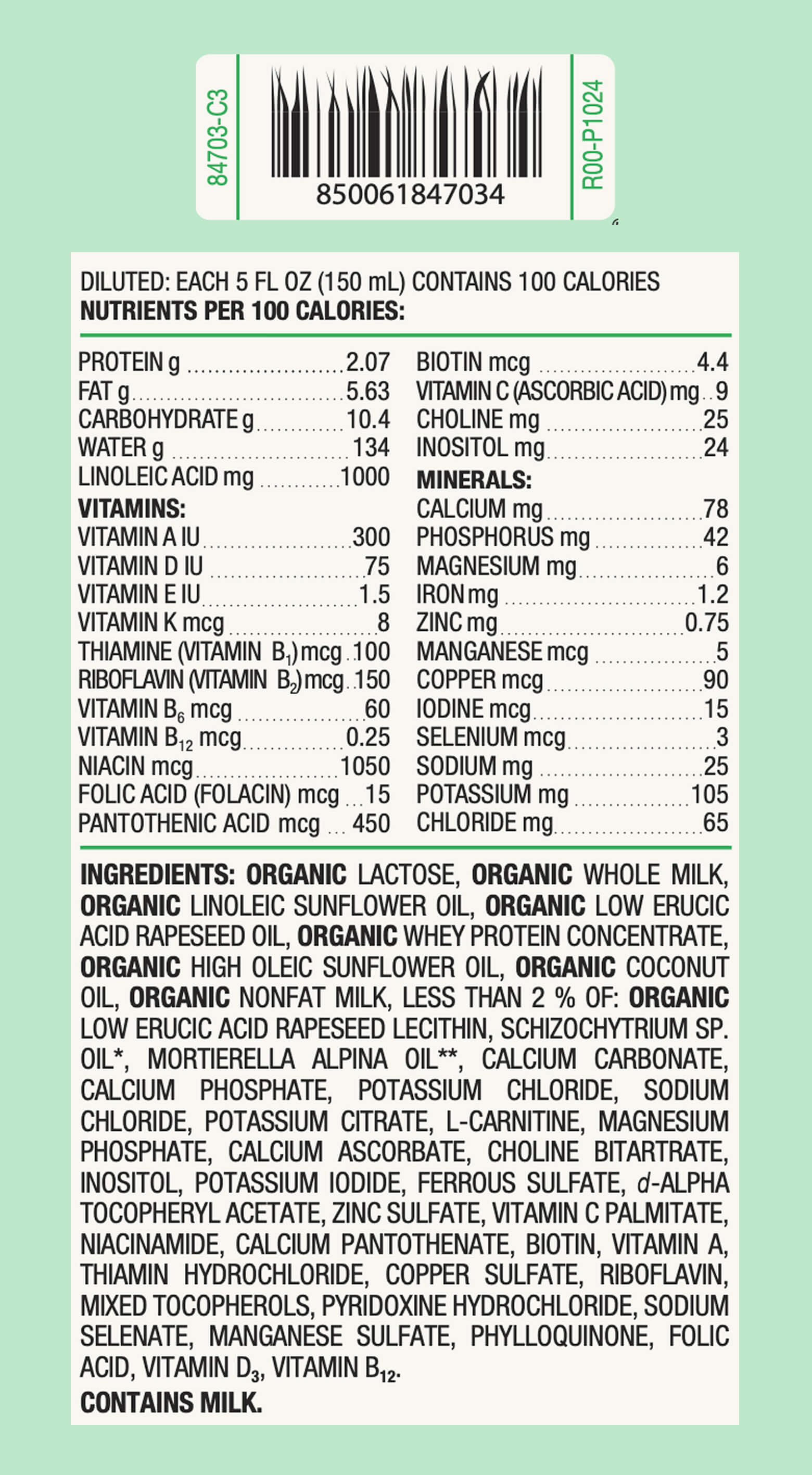 Organic Lactose, Organic Nonfat Milk, Organic High Oleic (Safflower Or Sunflower) Oil, Organic Canola Oil, Organic Whey Protein Concentrate, Organic Coconut Oil, Organic Linoleic (Sunflower Or Safflower) Oil, Less than 1%: Organic Canola Lecithin, Schizochytrium Sp. Oil*, Mortierella Alpina Oil**, Calcium Phosphate, Potassium Citrate, Sodium Chloride, Calcium Carbonate, Potassium Hydroxide, Potassium Phosphate, Magnesium Chloride, Potassium Bicarbonate, Ferrous Sulfate, Potassium Chloride, Zinc Sulfate, Cupric Sulfate, Manganese Sulfate, Potassium Iodide, Sodium Selenite, Choline Bitartrate, Ascorbic Acid (Vitamin C), Ascorbyl Palmitate, Inositol, L-Carnitine, Mixed Tocopherol Concentrate, dL-Alpha Tocopheryl Acetate (Vitamin E), Niacinamide (Vitamin B3), Calcium Pantothenate, Vitamin A Palmitate, Riboflavin (Vitamin B2), Thiamine Hydrochloride (Vitamin B1), Pyridoxine Hydrochloride (Vitamin B6), Folic Acid, Phytonadione (Vitamin K), Biotin, Cholecalciferol (Vitamin D3), Cyanocobalamin (Vitamin B12). Contains Milk |
