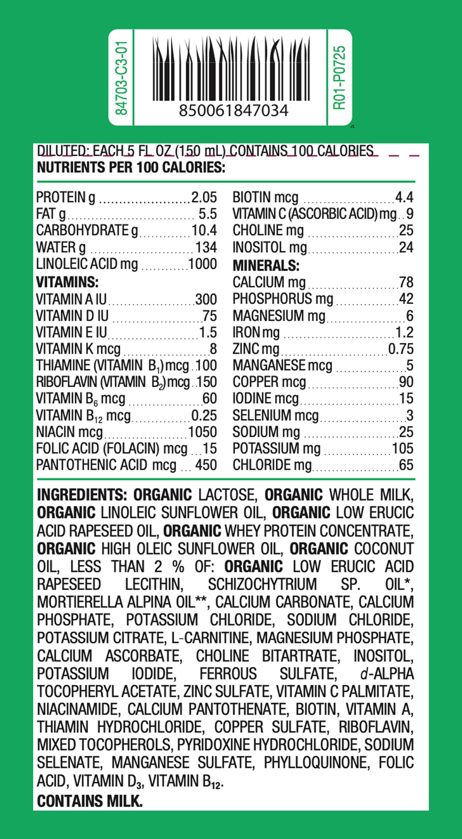 Organic LACTOSE, Organic NONFAT MILK, Organic HIGH OLEIC SUNFLOWER OIL, Organic SOYBEAN OIL, Organic WHEY PROTEIN CONCENTRATE, Organic COCONUT OIL, LESS THAN 2%: ORGANIC SOY LECITHIN, SCHIZOCHYTRIUM SP. OIL*, MORTIERELLA ALPINA OIL**, CALCIUM CARBONATE, CALCIUM PHOSPHATE, SODIUM CHLORIDE, POTASSIUM CHLORIDE, POTASSIUM CITRATE, L-CARNITINE, MAGNESIUM PHOSPHATE, CHOLINE BITARTRATE, CALCIUM ASCORBATE, INOSITOL, POTASSIUM IODIDE, FERROUS SULFATE, dl-ALPHA TOCOPHERYL ACETATE, ZINC SULFATE, VITAMIN C PALMITATE, NIACINAMIDE, CALCIUM PANTOTHENATE, BIOTIN, VITAMIN A, THIAMIN HYDROCHLORIDE, COPPER SULFATE, RIBOFLAVIN, MIXED TOCOPHEROLS, PYRIDOXINE HYDROCHLORIDE, SODIUM SELENATE, MANGANESE SULFATE, PHYLLOQUINONE, FOLIC ACID, VITAMIN D3 AND VITAMIN B12. Contains milK & Soy |